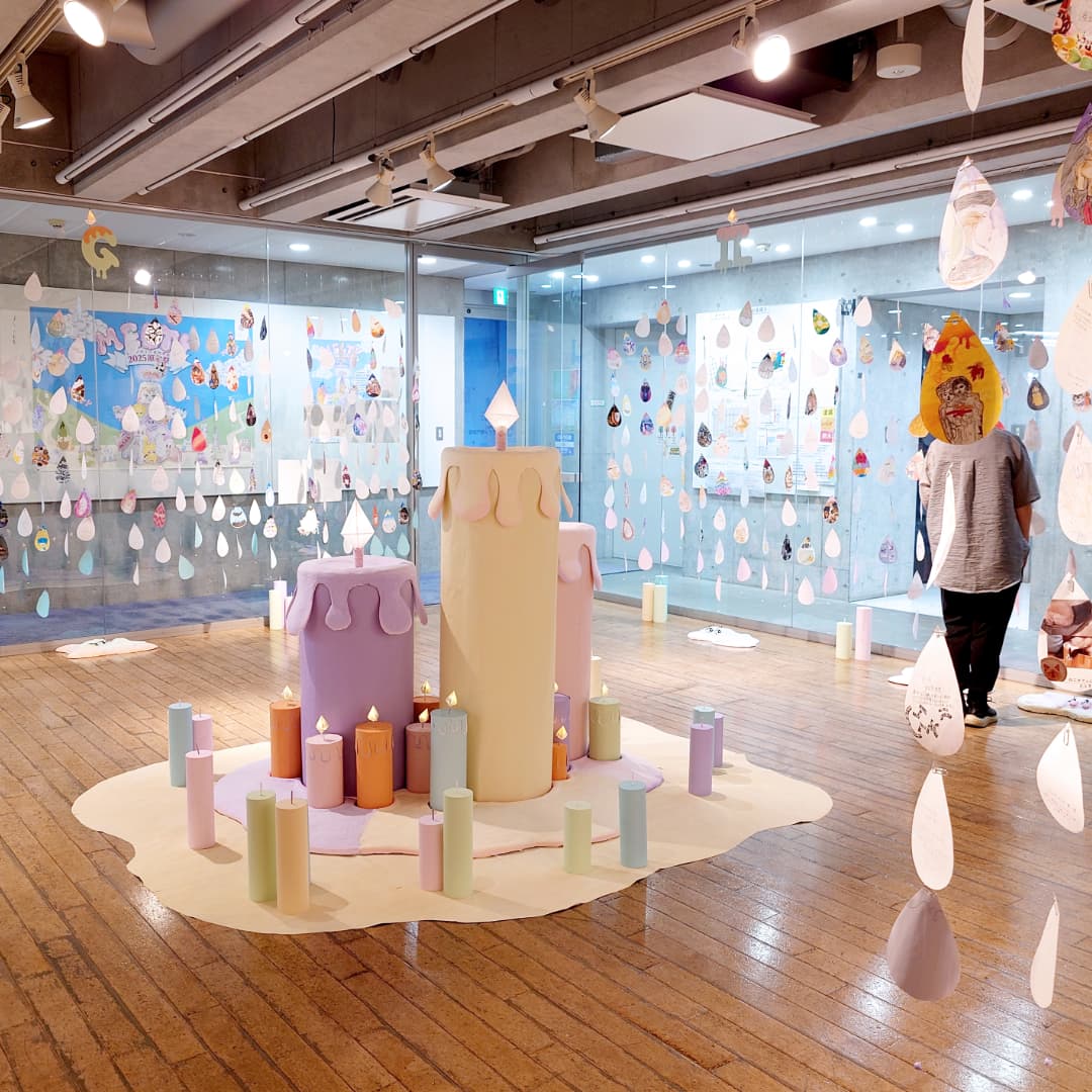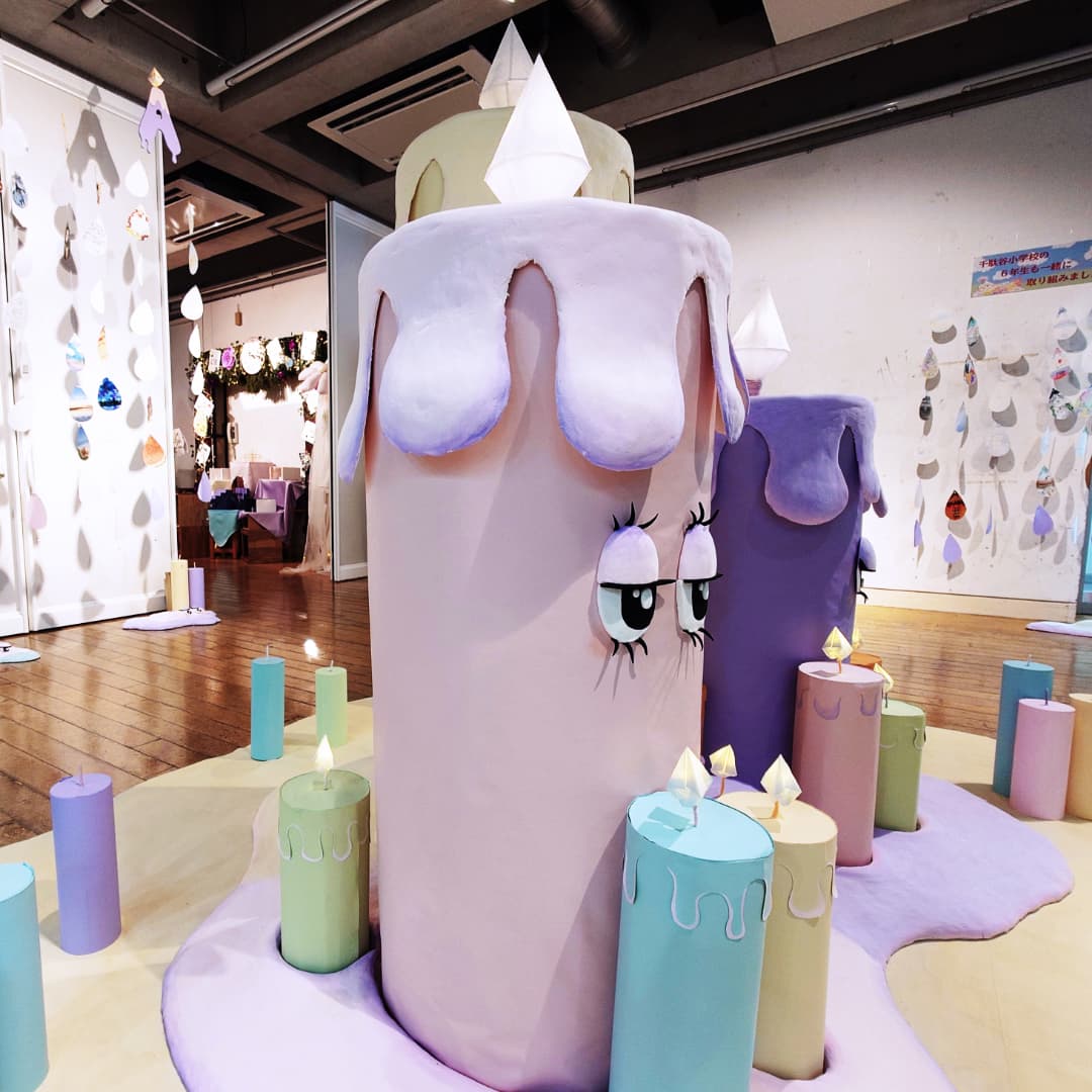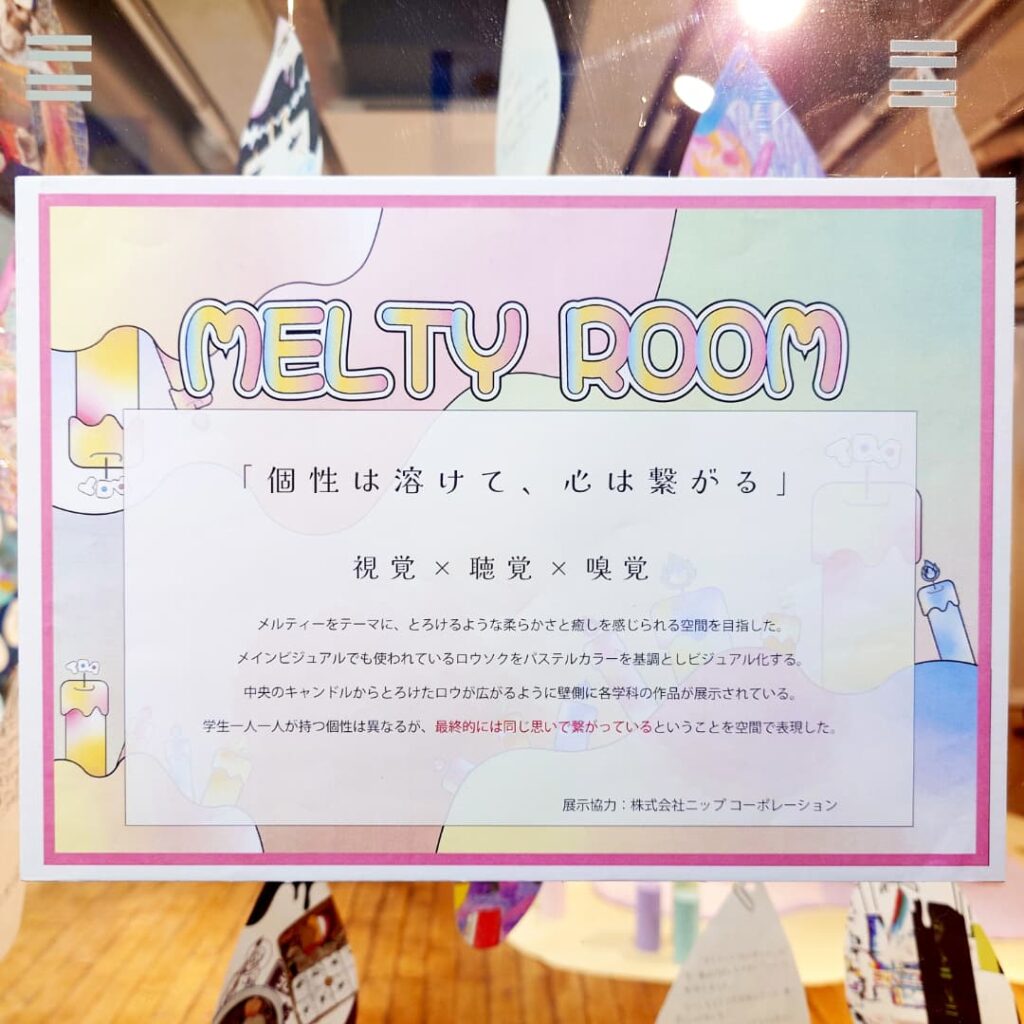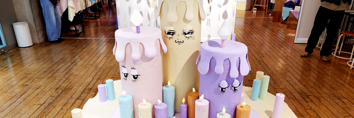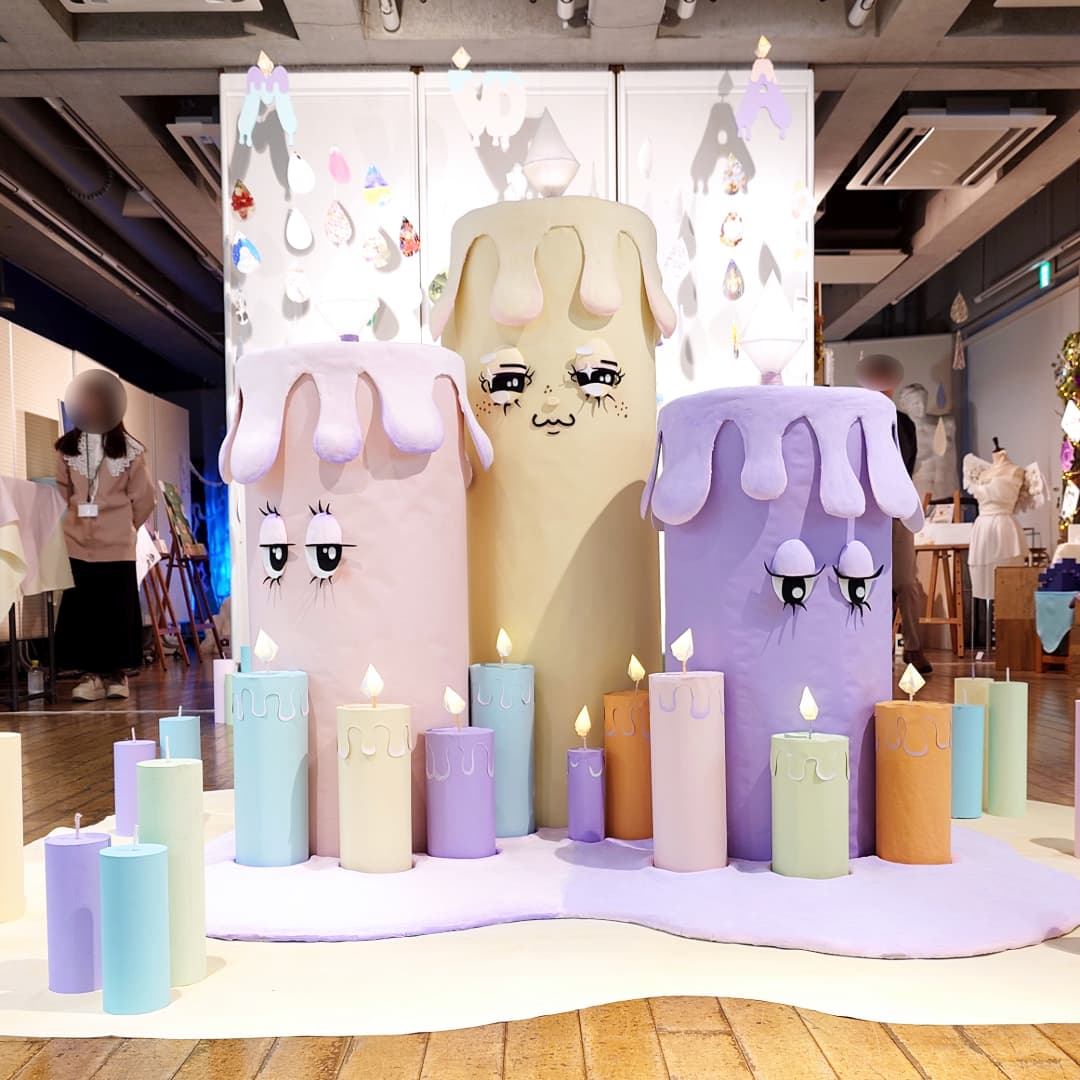 パステルカラーを基調とした淡く優しい空間の中で、中央のキャンドルから溶け出したロウが広がるように、各学科の作品が展示されています。
