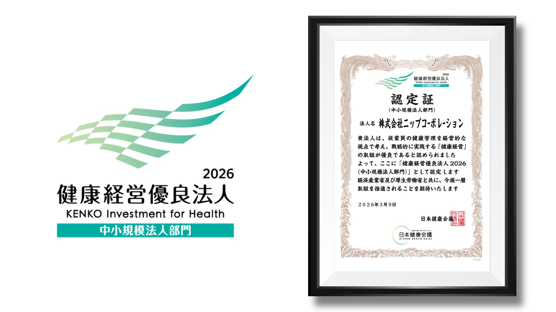 2026年3月、「健康経営優良法人2026」の認定を取得しました。