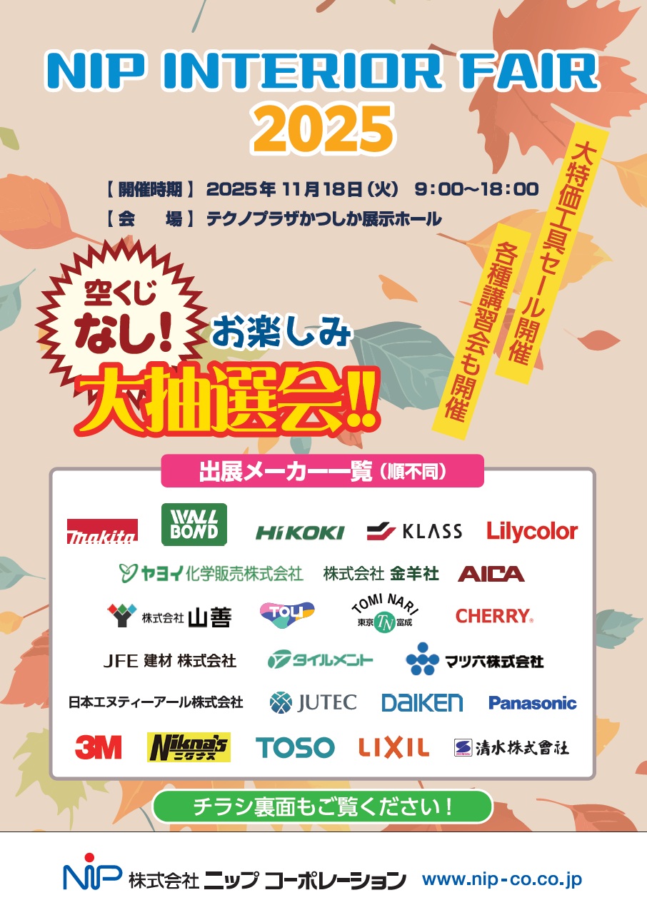 2025年11月18日(火)、テクノプラザかつしかにて、小岩営業所 即売会「NiP INTERIOR FAIR 2025」を開催いたします。