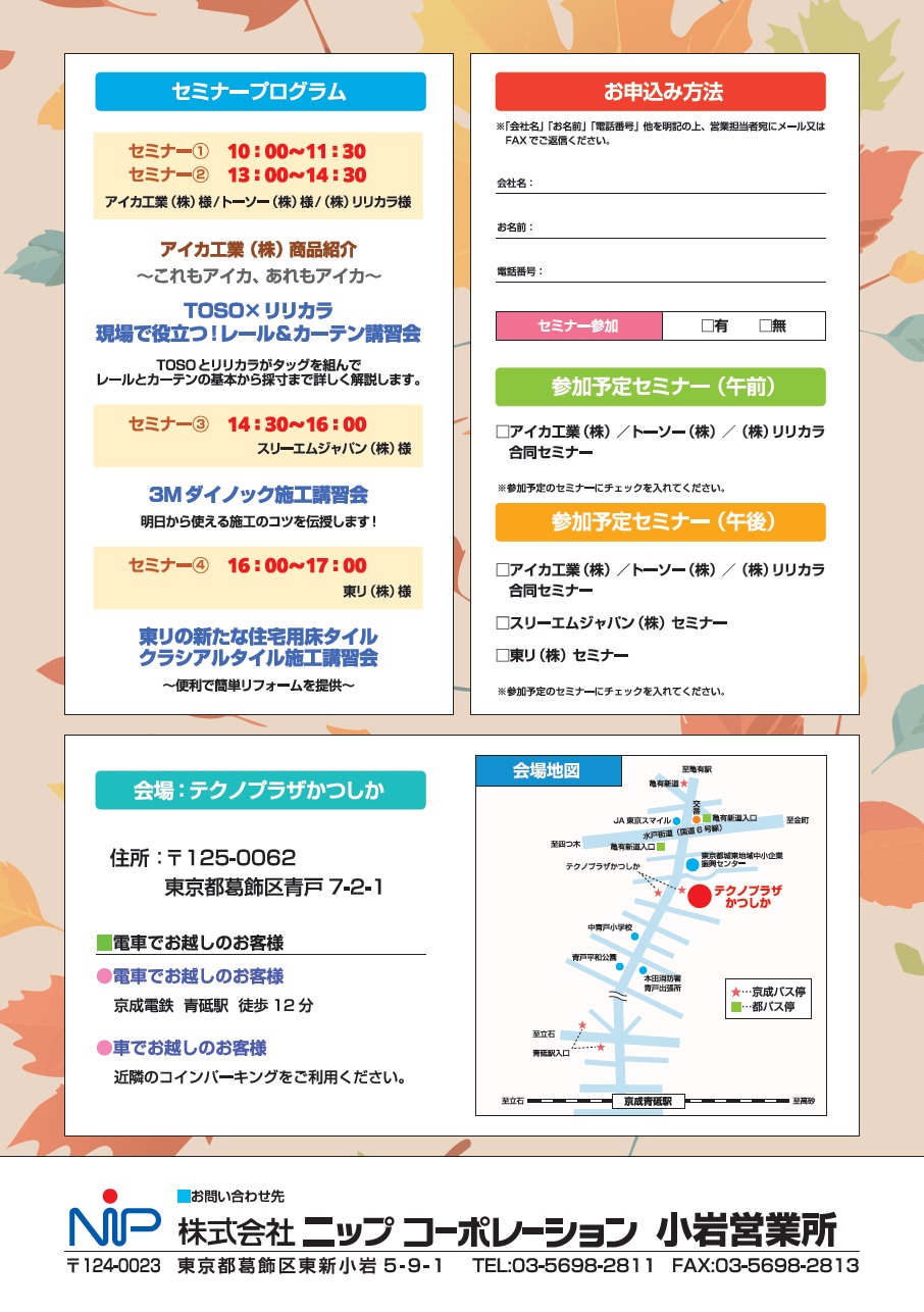 セミナーにご参加希望のお客様は、小岩営業所の営業担当までご連絡ください。